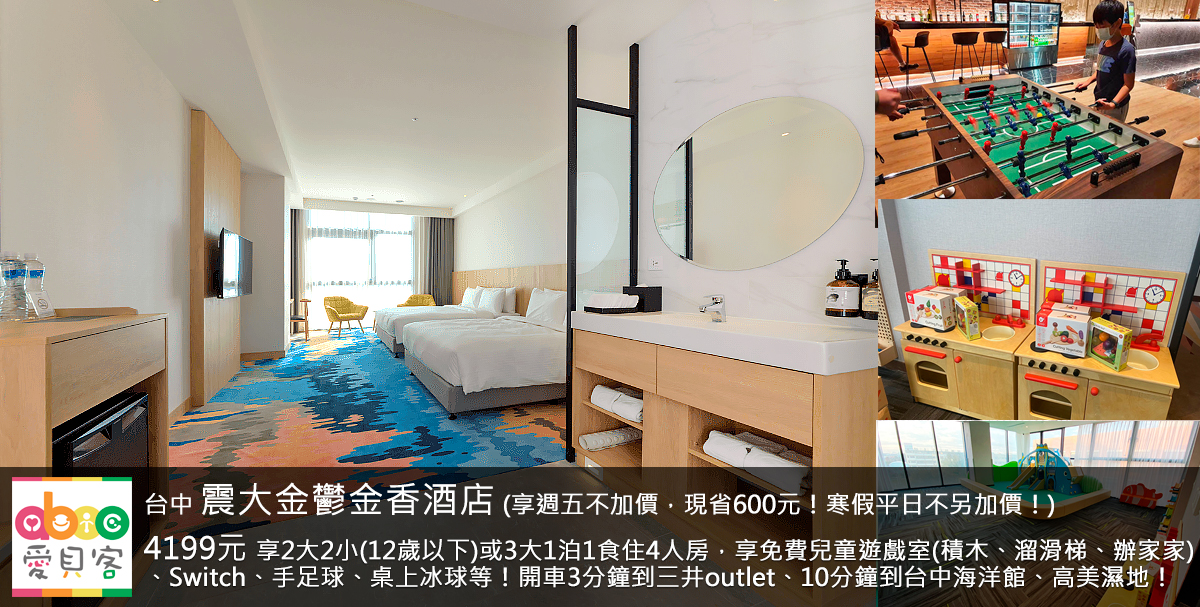 寒假平日不另加價!享週五不加價!想來台中市玩的家庭看過來!2023年全新開幕的台中震大金鬱金香酒店,2大2小(12歲以下)或3大1泊1食升等住溫馨家庭房(4人房)只要4199元的超優惠專案!可享飯店豐富吃到飽早餐,飯店還有提供兒童遊樂空間,鄰近台中港、梧棲觀光漁港、開車3分鐘到三井OUTLET PARK、開車10分鐘到知名的高美濕地,是想來中部住宿家庭的最新選擇,大人小孩都開心!入住期可至2026/02/13!