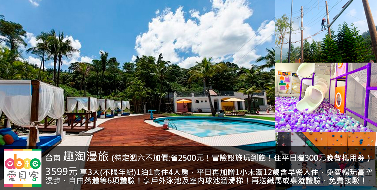 特定週六不加價(現省2500元,01/03、01/10、01/31、02/07)!寒假平日限量不加價(現省800元,不加價日期依線上顯示為主),再享農曆春節初五(02/21)入住只要加2500元限量優惠,先搶先贏!適合家裡有大朋友的家庭!快來試試全台第一家主打冒險體驗的特色飯店!由凱撒集團所推出的台南趣淘漫旅,飯店內超多適合想玩各種新奇有趣活動的家庭,此次推出多項大型冒險設施讓大家免費玩!本專案享3大(不限年紀)1泊1食平日只要3599元,平日/小假日入住加贈1小(未滿12歲)含早餐+6項活動、平日/小假日入住每房加贈300元晚餐抵用券乙張,再享飯店泳池與室內溜滑梯球池等設施!每房贈送鐵馬體驗1小時或免費桌遊租借體驗乙次/乙款(2選1),保証讓小朋友玩的開心,大朋友更是捨不得離開!