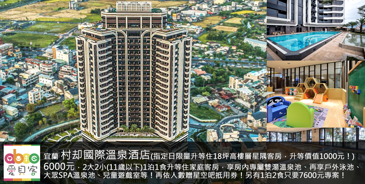 享指定日限量升等18坪高樓層星隅客房(升等價值1000元)!本專案可加價訂跨年夜(12/31)及農曆春節(2026/02/13-02/21),先搶先贏!宜蘭-村却國際溫泉酒店優惠專案又來了!這次談到平日2大2小(11歲以下)1泊1食升等住家庭客房平日只要6000元,平日2大2小(11歲以下)1泊2食(吃到飽早晚餐)升等住家庭客房平日只要7600元的超優惠專案,首次旺日週五週日不加價再省500元!每房再享房內專屬雙湯溫泉池、戶外泳池、兒童池、大眾SPA溫泉池、兒童遊戲室(攀爬區、桌遊繪本、大積木)等設施!吃到飽早餐可享用到中午12:30的早午餐!每房加贈星空酒吧券(依人數提供,總價值200元/張,每人需低消400元+10%,限入住期間使用)!