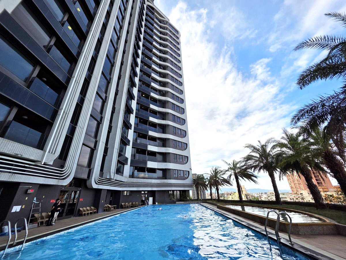 戶外的泳池為溫泉活水游泳池,泳池配上四週種植的綠色樹木與蔚藍的天空,悠游在泳池內感覺能釋放平常上班的壓力,讓身心回復平衡和諧的舒適感(使用游泳池需著完整泳衣及泳帽)。