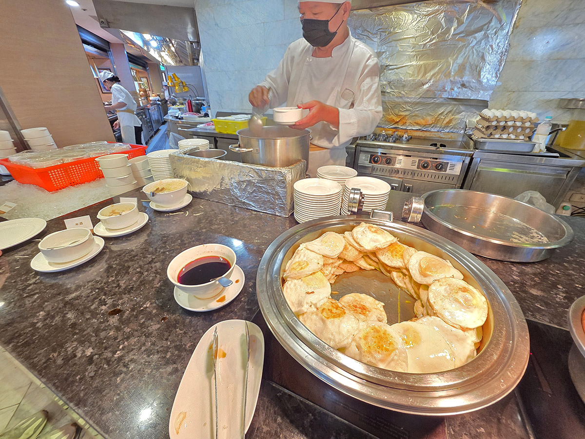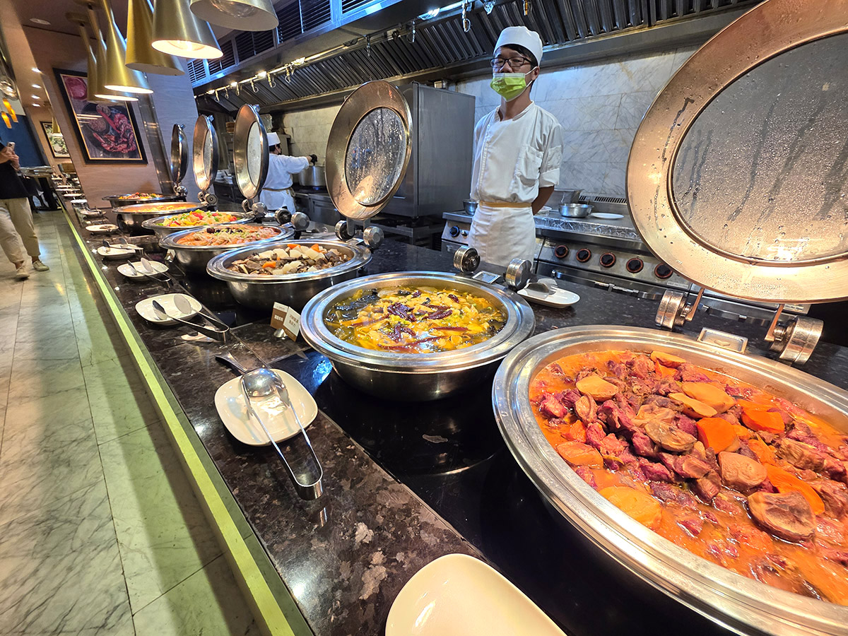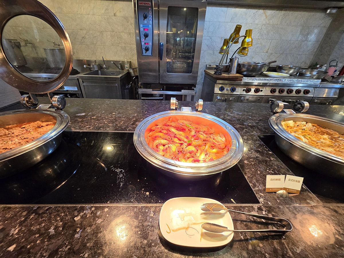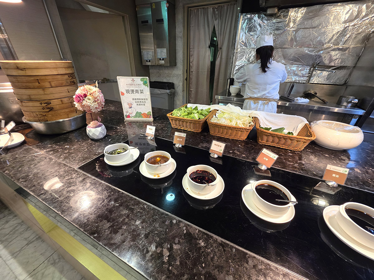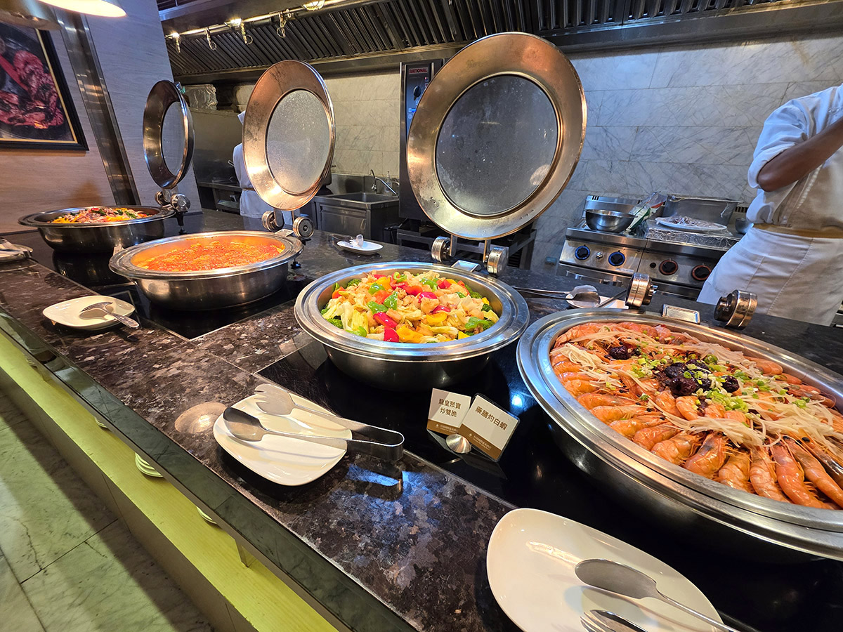 有像是燴牛肉、燉羊肉、魚非力、炒時蔬、灼白蝦、蒸排骨、小籠包等熱食大菜可以選擇,另外也有專門的素食區給吃素的家庭。