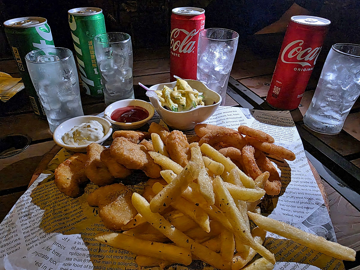這次每房有依人數贈總價值200元/張的星空酒吧抵用券(每人低消400元+10%),晚上可以持抵用券到頂樓來用餐,點一盤炸物大約500元左右。飲料的話,可樂果汁等一杯約150元、啤酒一瓶約200元。