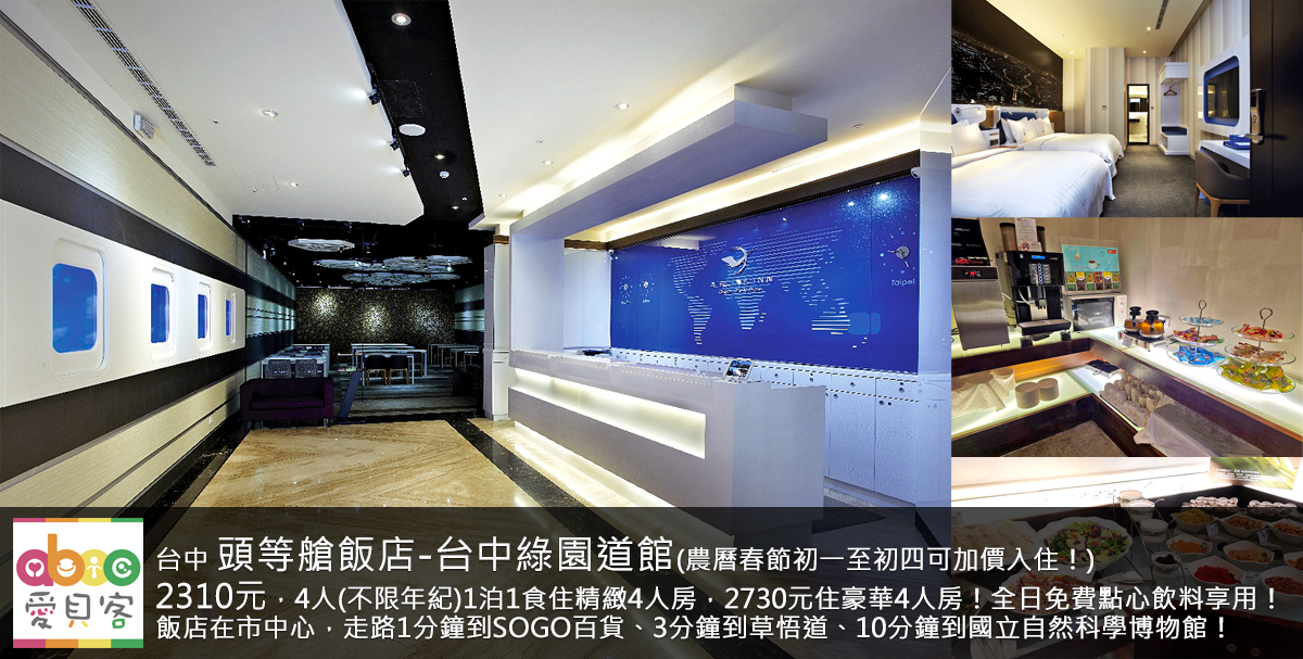寒假早鳥!本專案加碼享農曆春節(02/17-02/20)可加價入住! 想來台中市玩的家庭看過來,愛貝客首次推出頭等艙飯店-台中綠園道館,以機艙座艙為主題的旅店,本專案為4人(不限年紀)1泊1食住精緻4人房(無窗)平日2310元(寒假平日2475元),4人(不限年紀)1泊1食住豪華4人房(有窗)平日只要2730元(寒假平日2925元)的超值優惠專案!每房贈送台中知名名產店-旅禾泡芙之家50元折價券及經典小圓餅加購折價券各兩張!週一至週五入住再享延遲退房一小時(連續假期不適用)!