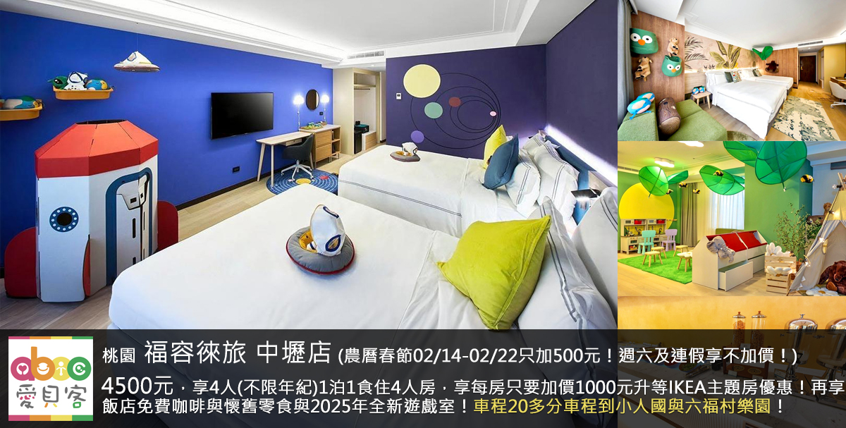 福容徠旅中壢店-集旅四人房住宿乙晚+依專案人數免費享用自助式早餐+專案享每房每晚加價1000元升等IKEA主題房(星旅-Planet外太空4人房或森旅-Forest森林4人房)+2025年4月全新IKEA兒童遊戲室(廚房扮家家酒組、小帳篷、鑽籠、車車軌道組等玩具)+飯店7樓的樂聚 JOIN'S CAFÉ(懷舊零食飲料免費享用)+迎賓飲料+免費提供上網服務+免費停車(數量有限,停滿為止)