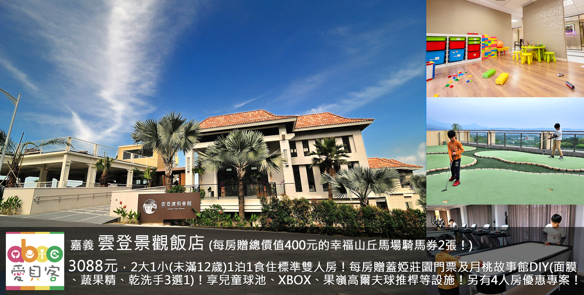 這次愛貝客推出雲登景觀飯店,飯店就在阿里山下,緊鄰美麗漂亮的棕梠湖高爾夫球場旁,視野極佳,景致超美哦!這次推出2大1小(未滿12歲)1泊1食住雲登標準雙人房平日只要3088元,平日享免費升等住觀景雙人房(升等房間數量有限,依現場安排為主),每房贈幸福山丘馬場騎馬券2張(價值400元)、贈蓋婭莊園門票2張(價值100元/張)及贈月桃故事館免費DIY活動(面膜、蔬果精、乾洗手3選1)!房間皆配置浴缸、再享飯店免費玩高爾夫球推桿練習場、兒童遊戲室、球池、手足球、XBOX遊戲等!另有4大入住4人房專案(請點此)!
