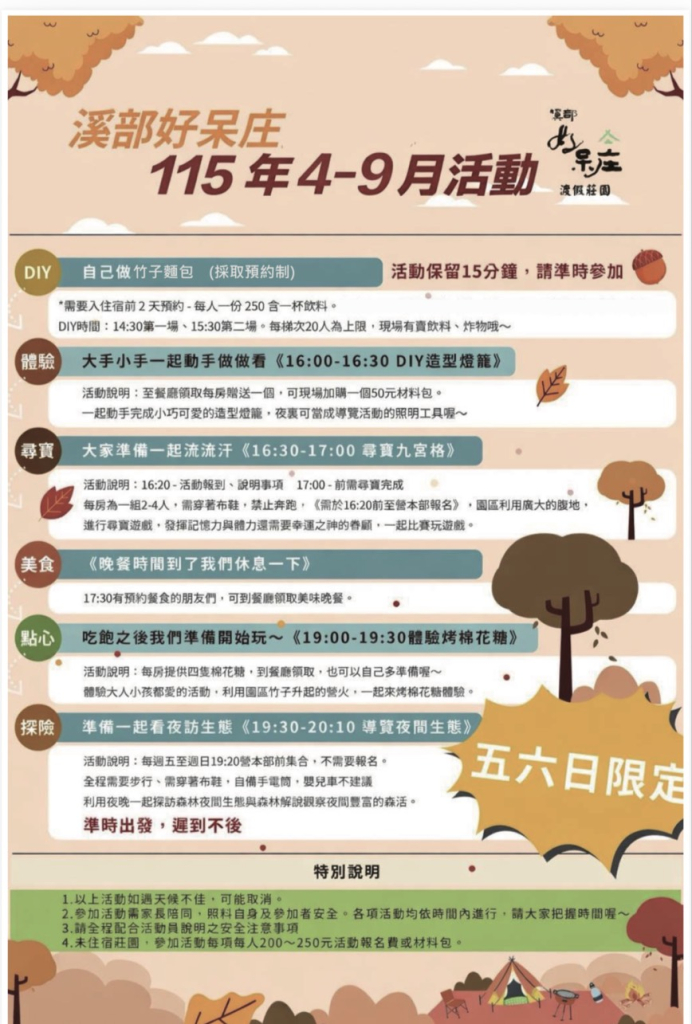 本專案每房贈燈籠DIY*2份(16:00-16:30前到需到溪部餐廳領取製作)!退房後再送鳳凰谷鳥園門票2張(價值50元*2)、贈采棉居觀光工廠DIY2張(價值100元*2,隨季節調整)!