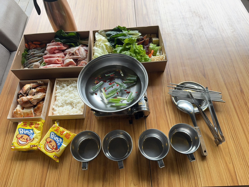也可以選擇1泊2食專案,  晚餐食材內容說明《野炊山煮鍋》2-4人一份,生食: 土雞火鍋(半隻生土雞)肉片16片、蝦子8隻、菜盤: 火鍋蔬菜、主食:王子麵2份+白飯2份、熟食:烤雞一份(半隻)並提供器具:卡式爐一台、火鍋鍋子一個、湯匙一隻、四人份餐具(鐵盤+鐵碗+鐵筷)。(內容參考,依實際為主)
