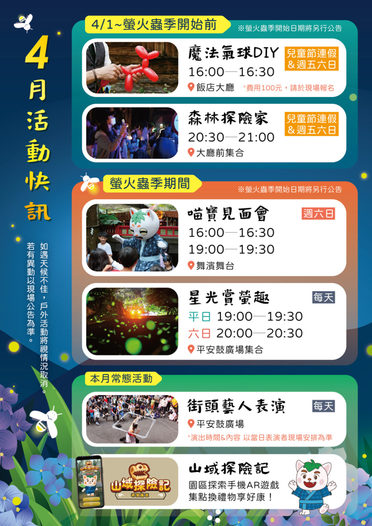 而在溪頭平安鼓這邊,明山森林-溪頭松林町會定時舉辦各種精彩的活動,有時還有各種可愛的森林大明星還會在現場所有的旅客一起同樂。