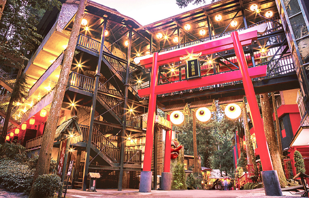 日式園區以鳥居前廣場為中心,創造出一個村落,整個街道充滿了各式各樣奇特造型的妖怪塑像,配上大紅燈籠,更顯出日式風情的神祕感。