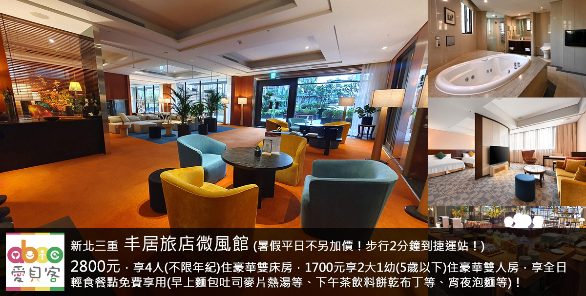 暑假平日不另加價!三重-丰居旅店微風館2800元享4人住豪華雙床房、1700元享2大1幼(5歲以下)住豪華雙人房,享全日輕食餐點免費享用(早上麵包吐司麥片等、下午茶飲料餅乾布丁等、宵夜泡麵等)!飯店旁近捷運站出口,交通方便!