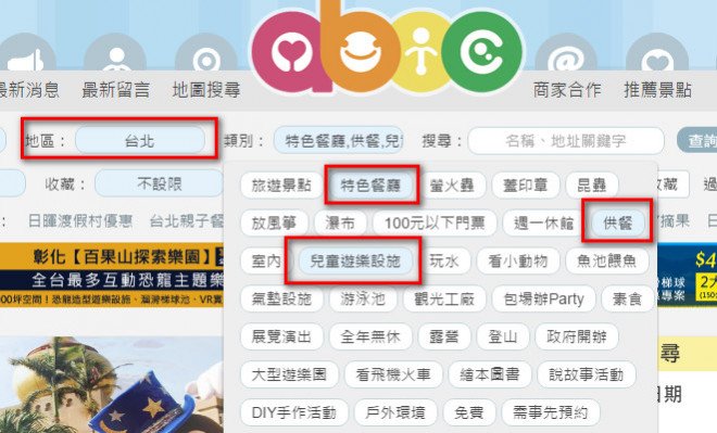其實在我們的網站上,基本上有任何的需求,都可以直接點選,像是您的需求是「台北」玩,且要有餐廳,就可以用下列的方式搜尋。