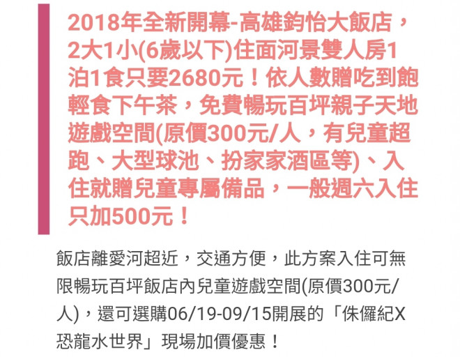 不小心按到,釋出一組高雄鈞怡大飯店2大1小序號