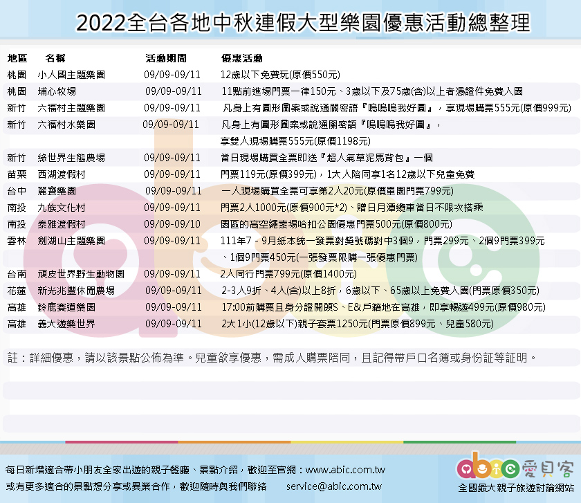 中秋節連假09/09-09/11全台各地的大地主題樂園都有優惠活動哦,票價折扣最多還有能免費入場哦,快來看看。