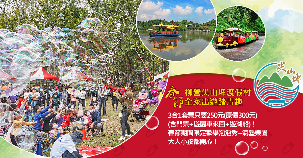 柳營尖山埤渡假村佔地廣大、環境優美、休閒設施多元,超適合帶長輩與小朋友一起來。今年春節期間(01/22-01/25)加碼推出「玉兔迎春-氣墊泡泡親子樂園」主題活動!舉辦熱鬧的市集、歡樂泡泡秀與氣墊樂園等活動,長輩來散步賞景,小朋友嗨玩泡泡派對,全家大小都開心,春節期間就來柳營尖山埤渡假村走春吧!