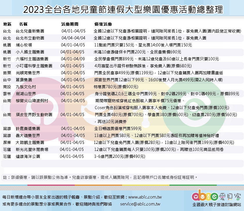 兒童節連假要去哪裡呢?04/01-04/05全台各地的大地主題樂園都有優惠活動哦,快來看看,也歡迎分享!
