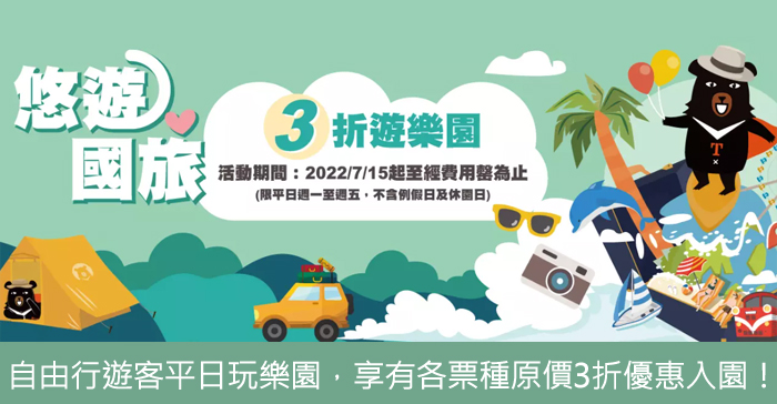 2022/07/15至10/07為止,限平日週一至週五,不含例假日及休園日,前往參與活動之18間觀光遊樂業,即可依其票種享原價3折入園優惠。