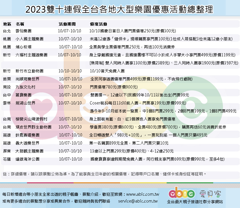 10/07-10/10全台各地的大地主題樂園都有優惠活動哦,票價折扣最多還有能免費入場哦,快來看看。