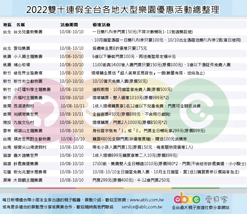 10/08-10/10全台各地的大地主題樂園都有優惠活動哦,票價折扣最多還有能免費入場哦,快來看看。