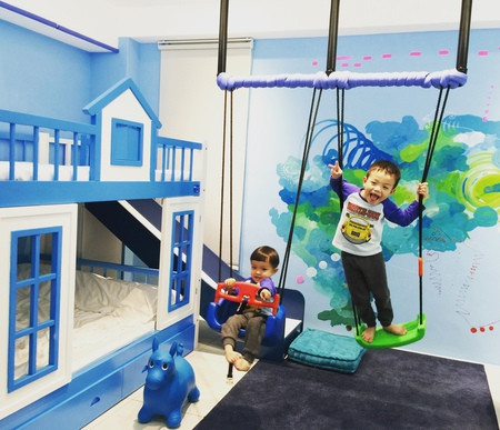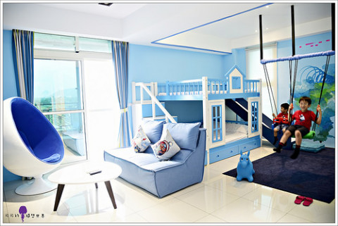 2間親子房格局相同分為粉色系與藍色系,城堡造型溜滑梯同時也是上下舖睡床,房內最棒的是還裝設幼兒盪鞦韆與兒童盪鞦韆,讓小朋友盡情擺盪。
