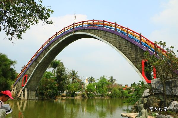 上摩天大橋是園內最高的景觀橋,彩色扶手亮麗又吸睛,走至頂點可遍覽整個園區,視野遼闊,不過階梯很陡,爸媽一定牽著小朋友一起走,最後看到帥氣的龍船表示到快出口了,出口處的魚池可以餵魚,這裡有飼料投幣機,也可自備魚飼料前來。