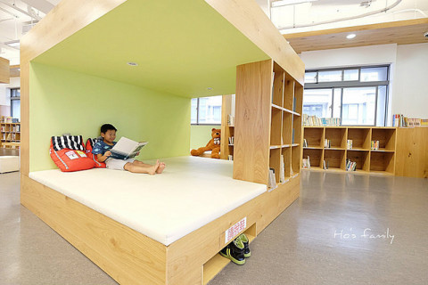 除了舒適的閱讀角落,還有大熊陪伴小朋友看書,另外溜滑梯造型的閱讀角,還能讓小小孩遊玩,一旁的故事小屋則定期舉辦說故事活動,兒童室還設有一區戶外閱讀室,木條窗框加上大片落地窗,帶點日式風情,童趣地毯上擺放彩色大型積木與動物座椅,可以讓小朋友活動一下,看完書還可以帶小朋友去公園跑跳,讓眼睛休息看看遠處。