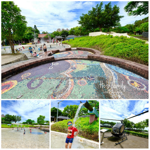 水池裡有三個噴水柱、一旁有SPA水柱,上方有大大小小的淺水池,要讓小朋友開心清涼一夏。