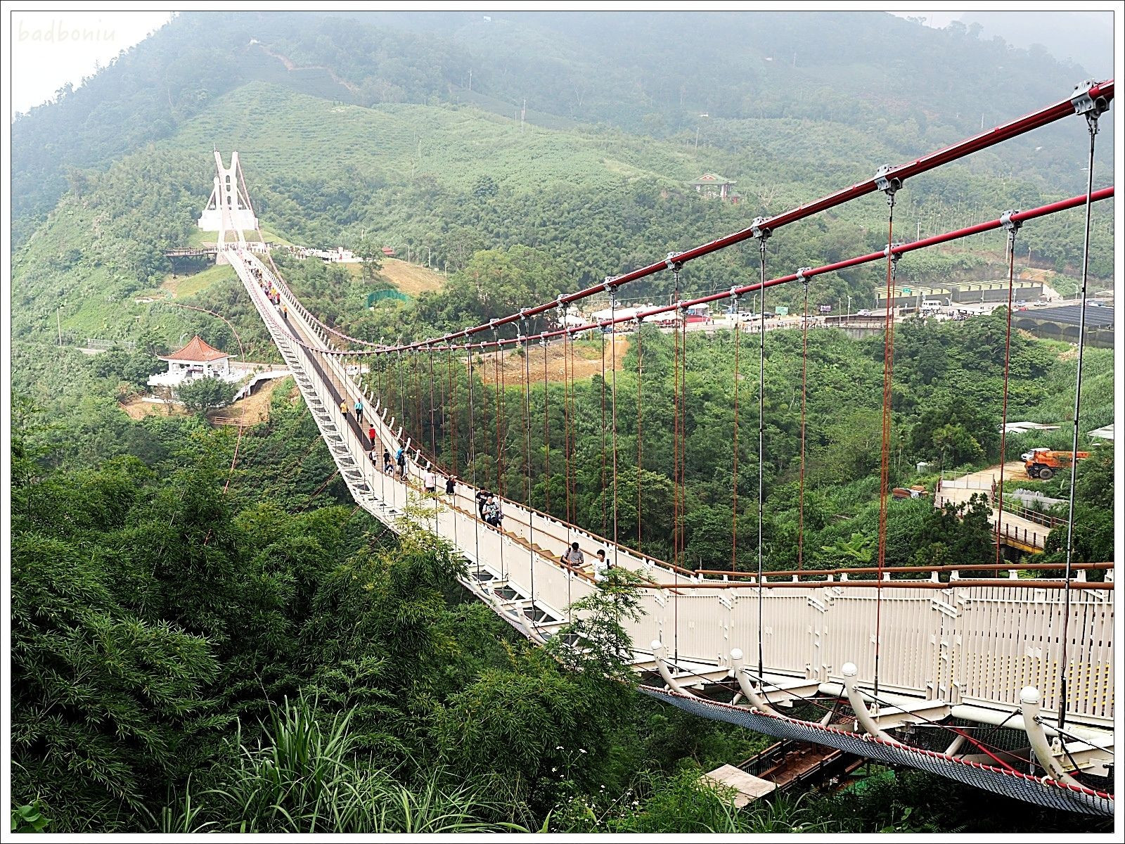 近看景觀吊橋非常壯觀,橋上景觀優美,天氣好的話,在太平雲梯上可遠眺整個嘉南平原,因高山常會起霧,置身雲霧之間就好像漫步在雲端,走至橋的中段,橋面中間設計成鏤空鐵網,膽子大一點的可以走上去往下看。走到盡頭後可選擇原路折返,時間充足的話可續走茶園步道至太平老街逛逛。