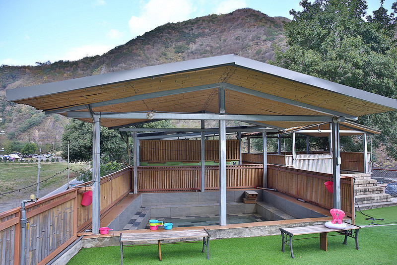 營地由群山環繞,景色優美。泡湯區分有2個大眾池與3個家庭池,露營可免費使用大眾池,喜愛一家人單獨泡湯的則可加價300元泡家庭池。夏季時溫泉池則改為山冷泉池,讓露友消消暑氣,這裡離巴陵古道生態園區,裡面步道輕鬆易行,生態豐富,可以安排一起順遊。