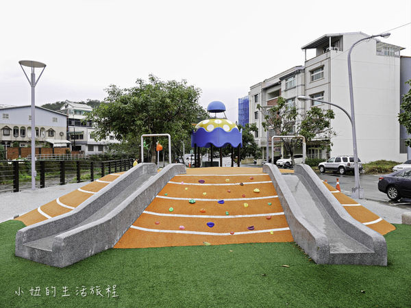 滑梯區使用仿草皮鋪面,小山丘造型磨石子溜滑梯有二個滑道,橘色的山丘很搶眼,山坡結合攀岩牆,讓小朋友手腳併用往上爬。溜滑梯前方有座大沙坑,另一側有繩網攀爬架與盪鞦韆,不同於一般的塑製溜滑梯,給小朋友全新的遊樂體驗。