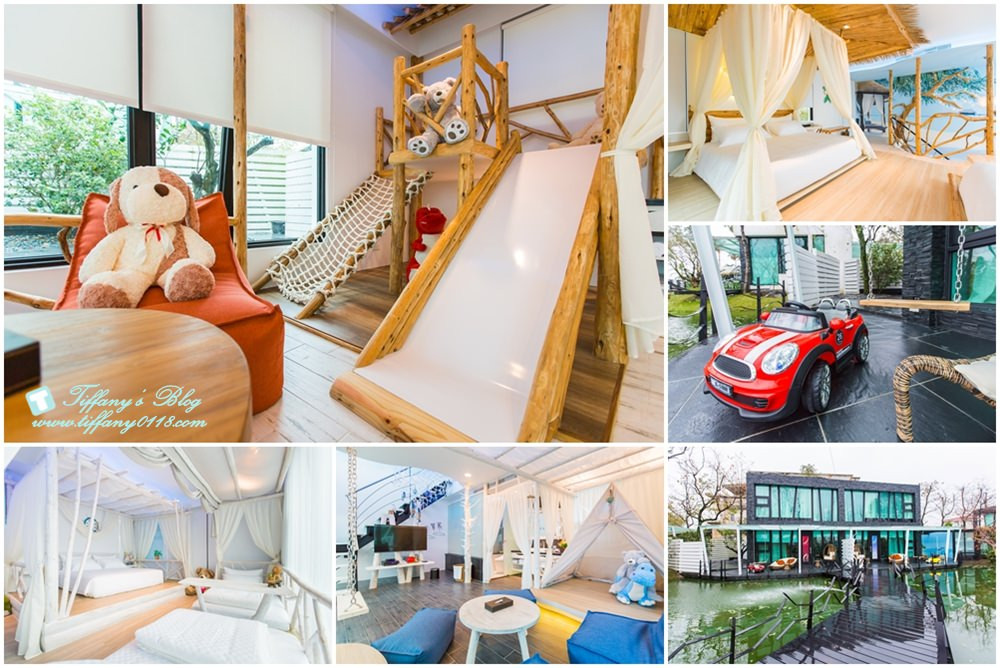 親子房型是獨立的一棟2間,一樓是遊戲空間、客廳與有大型泡澡浴缸的衛浴間,二樓則是睡覺的地方。二間分別是峇里島風與地中海風,峇里親子房有木製溜滑梯與繩網攀爬遊具,巴拉灣親子房則是帳篷與大型布偶,二間都有盪鞦韆、布偶玩具,還有專屬的兒童超跑。