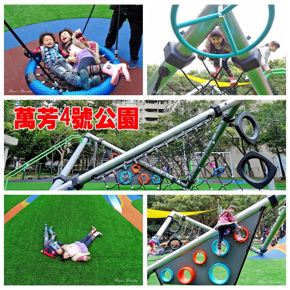 位在台北市文山區的萬芳4號公園也加入特色公園的行列了,公園2017年6進行改建,於2018年2月開始啟用,以人工草皮鋪面,有小山丘、繩網攀爬、沙坑、鳥巢鞦韆與跳樁等遊具,給大小朋友全新的遊樂環境。