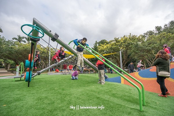 鳥巢鞦韆愈來愈常見了,爸媽想帶小朋友體驗這個鞦韆也不需跑遠,公園內也有成人體健設施,遛小孩之餘也可以運動一下。