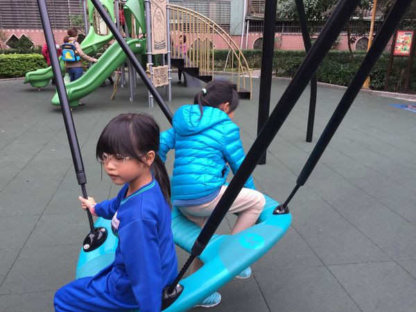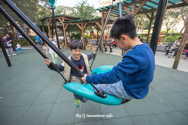 全新的溜索式盪鞦韆稱為籃子溜索,是全台首見的遊具,外觀像雙人盪鞦韆,可坐1-4人,爸媽可以站在二側幫忙推,在擺盪過程中非常刺激哦。
