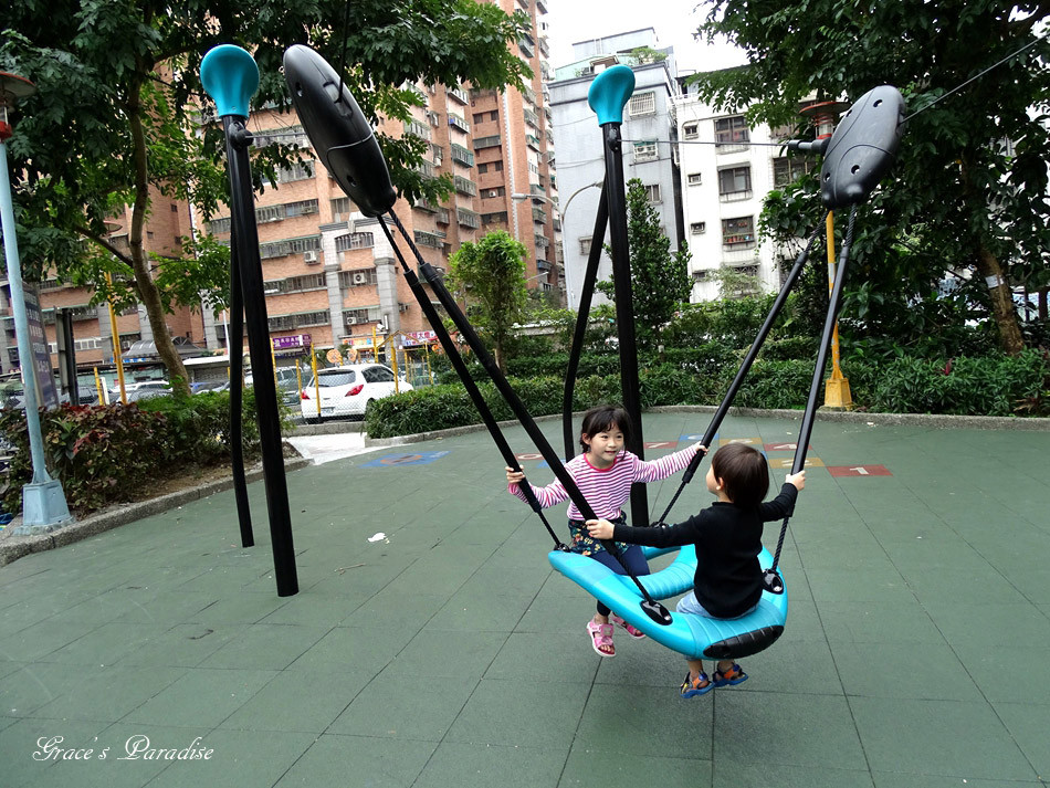 籃子溜索較適合大小孩玩,小小孩的話需注意速度與安全,一旁還有一組溜滑梯遊具,另一側有旋轉遊具,還有一些體健設施可以使用。