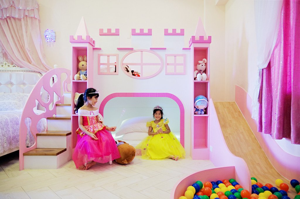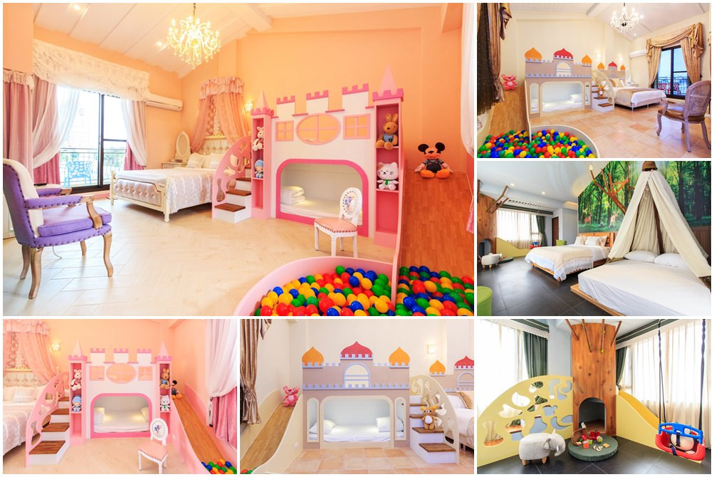 親子房型有城堡溜滑梯與森林野營溜滑梯二種,城堡滑梯下方有彩色球池,森林野營有秘密山洞與幼兒鞦韆,房內另有造型布偶與一些玩具可以玩。