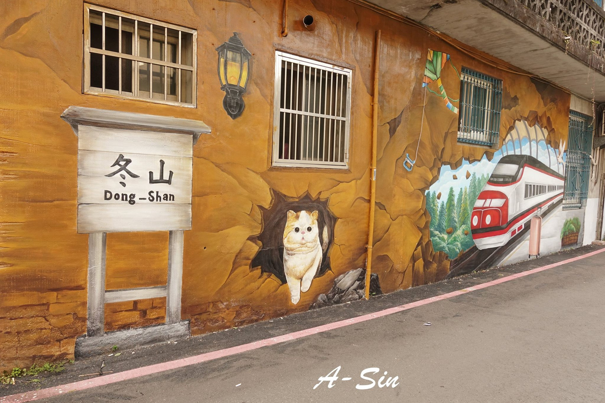 在宜蘭冬山火車站周邊,為了配合2017年綠博活動,在老街巷弄裡繪製不少精彩的3D彩繪牆,到了2018年3月再增加9幅彩繪牆與彩繪地景。