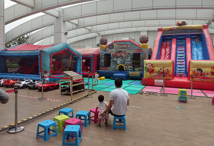 氣墊設施適合3歲以上,130公分以下小朋友遊玩,有一座大型溜滑梯、另三座是較小型的氣墊屋,學齡前小朋友可以在氣墊屋彈跳遊玩,兒童超跑有多款車型可以選擇。