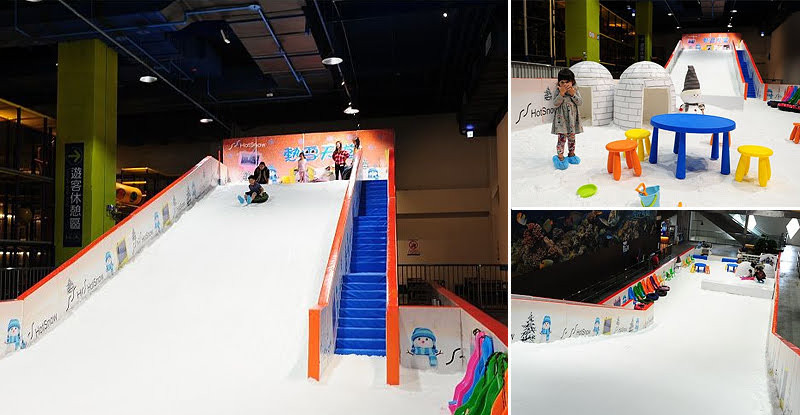 戲雪區很受小小孩歡迎,有二座小冰屋,獨家仿真雪材料摸起來就像雪一樣輕軟,小朋友好認真的坐在雪地裡堆雪人,場內也有不少挖沙玩具可以玩,且場內還會定時飄雪,每到飄雪時小朋友更興奮。