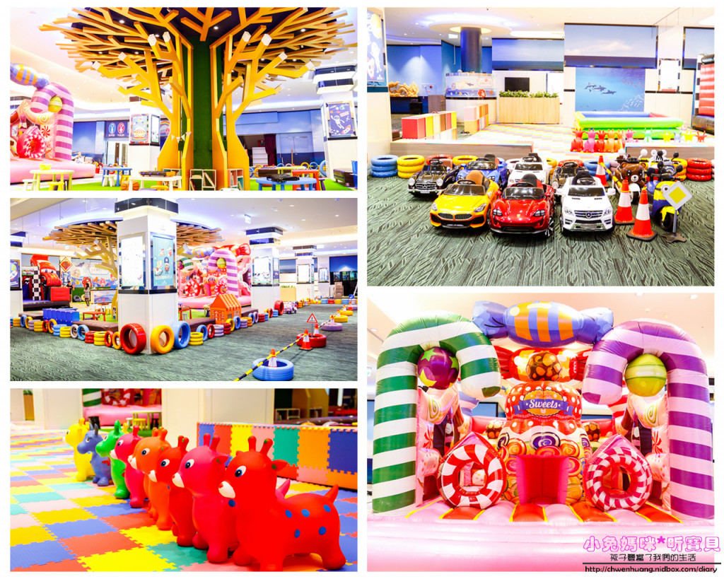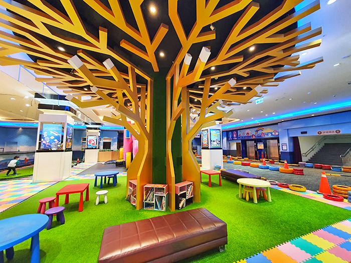 館內適合0-12歲小朋友遊玩,分為上下二層樓,一樓有樹屋溜滑梯球池、氣墊跳跳床、兒童超跑、籃球區、棒球區、繪本閱讀區。二樓是同年3月開放的,有造型滑步車、幼兒遊戲區(播放巧虎影片)、小火車、大型室內玩沙區、人工草坪滾大球、迷你冰球/手足球桌。