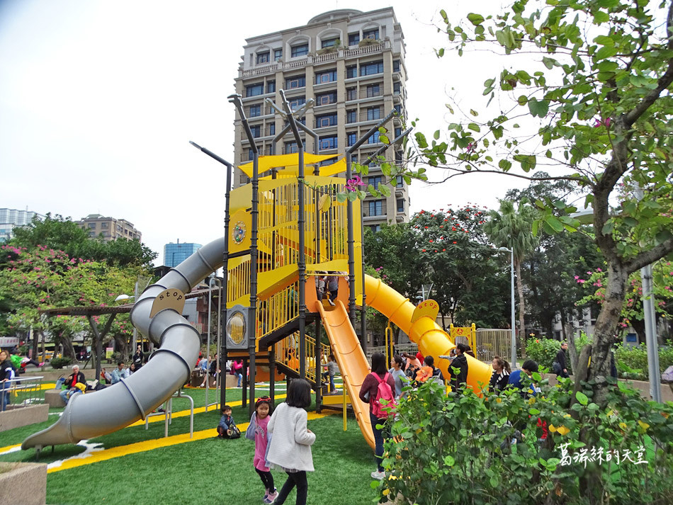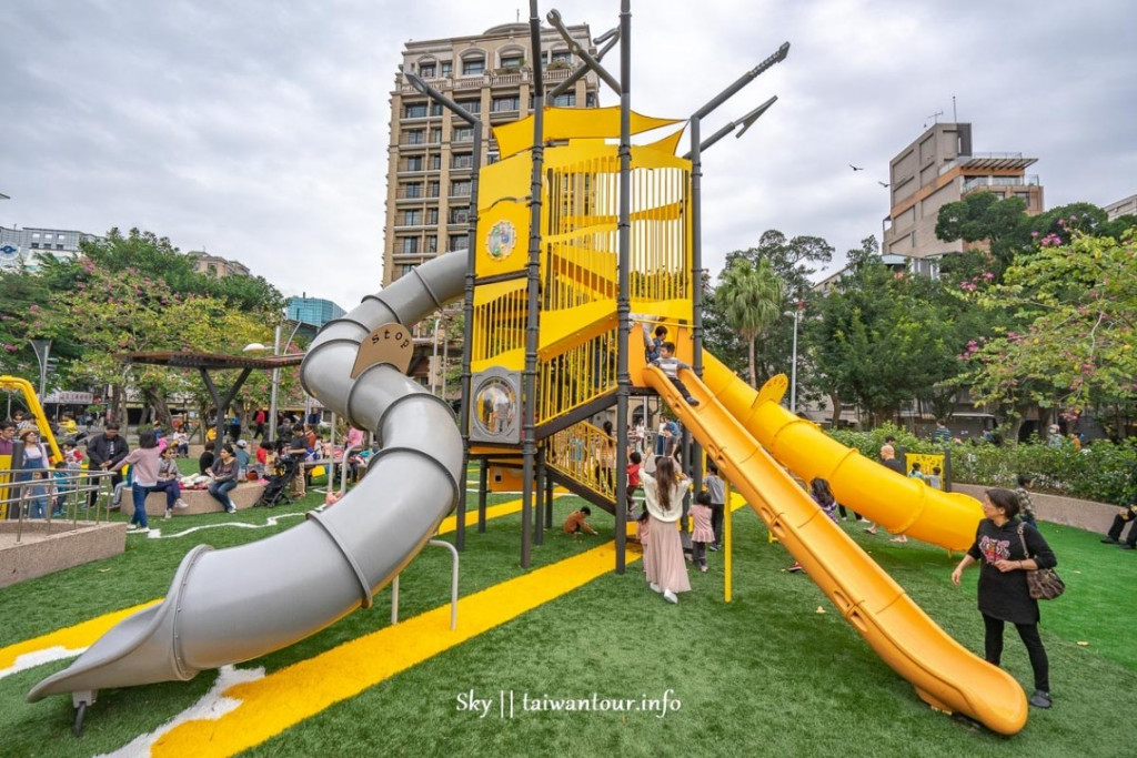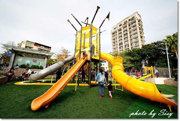 公園內最吸睛的就屬二層樓高溜滑梯,滑梯分為高、中、低三個滑道,滿足各年齡層小朋友。