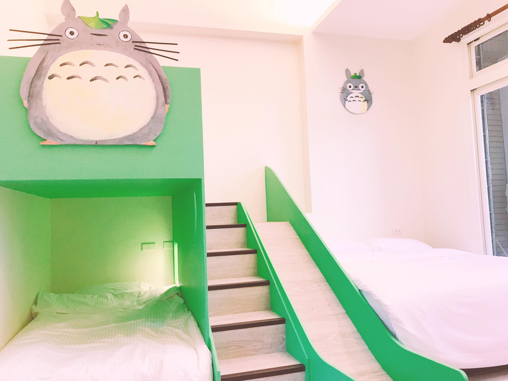 每間房型皆有主題裝潢,有神奇寶貝、賽車、龍貓、海賊王與風中奇緣,雙人房則提供小帳篷與彩色小球給小朋友玩,另外大廳也有提供跳跳馬。