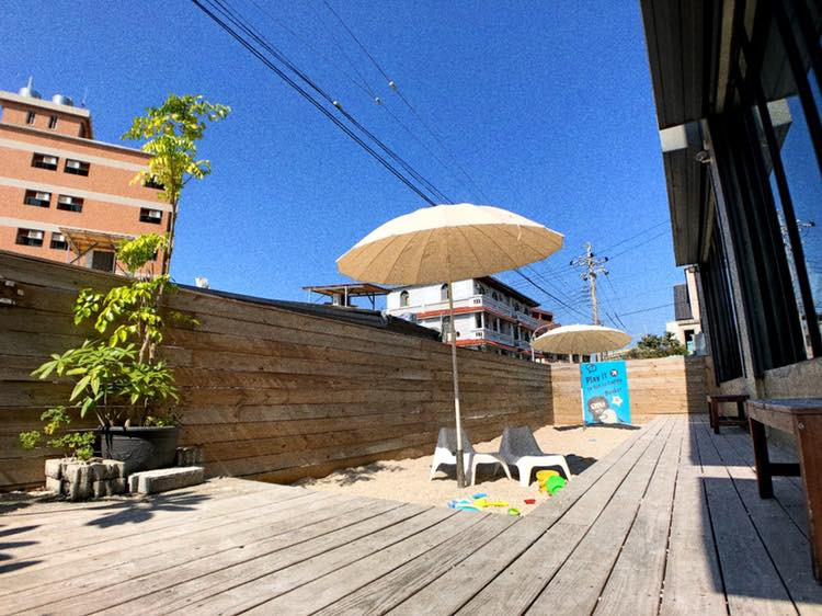 兒童戲沙區雖然在戶外,店家有擺放二個大陽傘為小朋友遮陽,一旁也有座椅讓陪伴的爸媽坐著休息,沙坑上也有不少挖沙玩具哦。