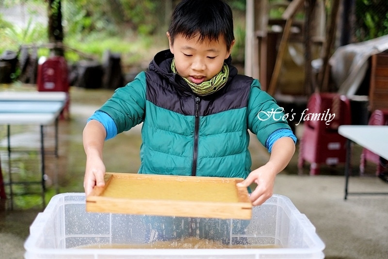 手抄紙的體驗很特別,對小朋友來說紙是日常最常見的物品,對能親手做出一張紙大感神奇。紙寮窩的手抄紙是以竹纖維製成,利用篩網將水裡的紙漿撈出並分布均勻再將水份吸乾,待紙張全乾後就完成嘍。