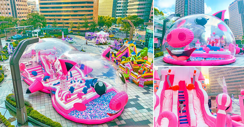 國內首座透明氣墊樂09/27來到台北統一時代歡樂開玩,萌萌的粉紅豬是一個大型透明泡泡屋,裡面有氣墊闖關、溜滑梯與粉色球池,一旁另有3座氣墊城堡可以玩。