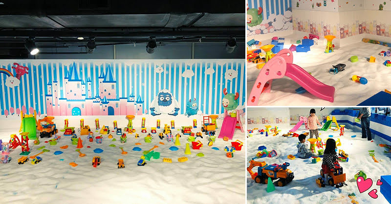 雪之堡外觀是座藍白色城堡,裡面是大片戲沙池,沙池上放滿挖沙玩具,還有幼兒滑梯、挖土機、運沙車、積木等,小朋友放進去就可以玩上陣子。