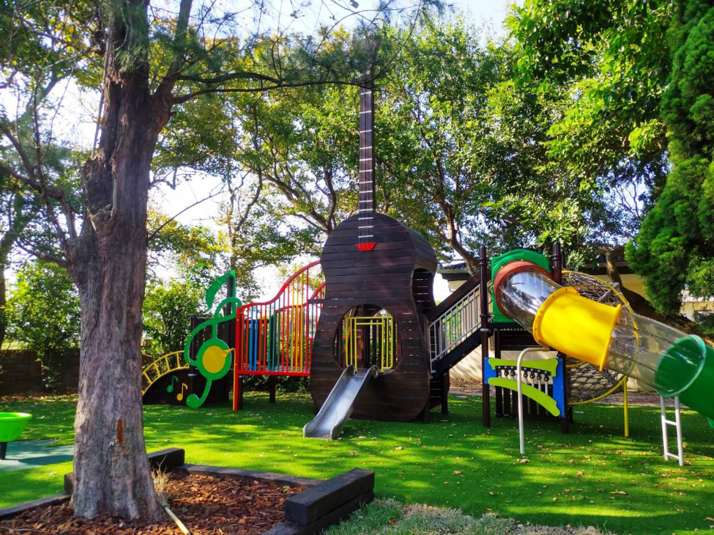 全新的遊戲場不再是一般的塑製溜滑梯,以音樂為主題,將樂器與遊具結合,巨大的吉他好醒目,有透明水管溜滑梯、金屬溜滑梯、繩網攀爬與傳聲筒等設施。