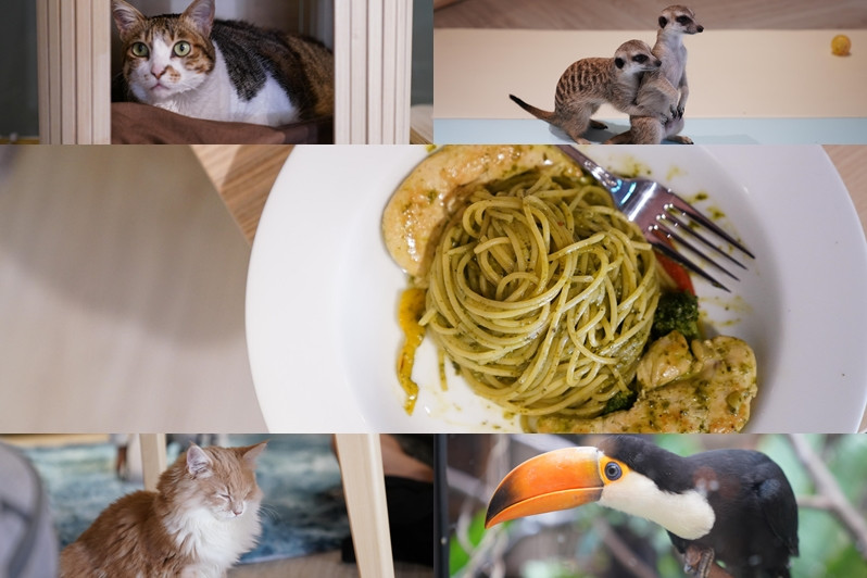 進入餐廳可與貓咪互動,店家也有提供逗貓棒,要與大嘴鳥或是狐獴互動則需店員帶領,大嘴鳥與狐獴這2種動物不僅少見,還比想像中親人,是很特別的體驗。用餐的話,有義大利麵、燉飯、鬆餅、炸物小點等選項。