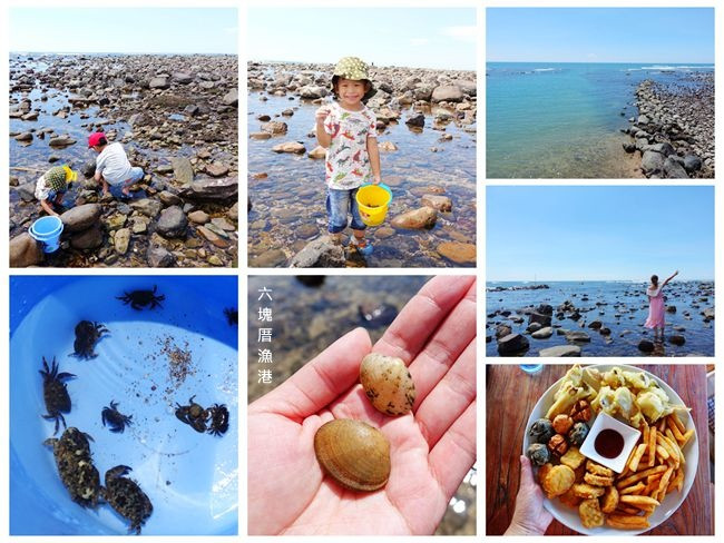 淡水-六塊厝漁港座落在淡金公路旁十號橋(大屯橋)附近海岸,是個清悠的小漁港,漁港旁有一片沙灘與潮間帶,是親子戲水好去處。
