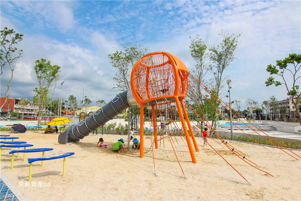兒童遊戲場是一座大型的沙坑,沙坑上有一個特別的水母造型溜滑梯,要玩溜滑梯不簡單,需手腳併用攀爬繩網而上,繩網也有不同設計,適合不同年齡層小朋友挑戰,溜滑梯旁還有多人旋轉椅、多人搖擺盤等設施,另一側有汲水幫浦。