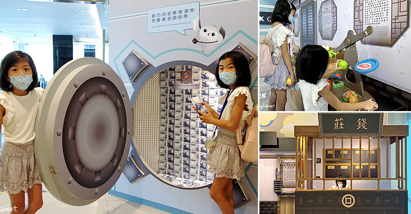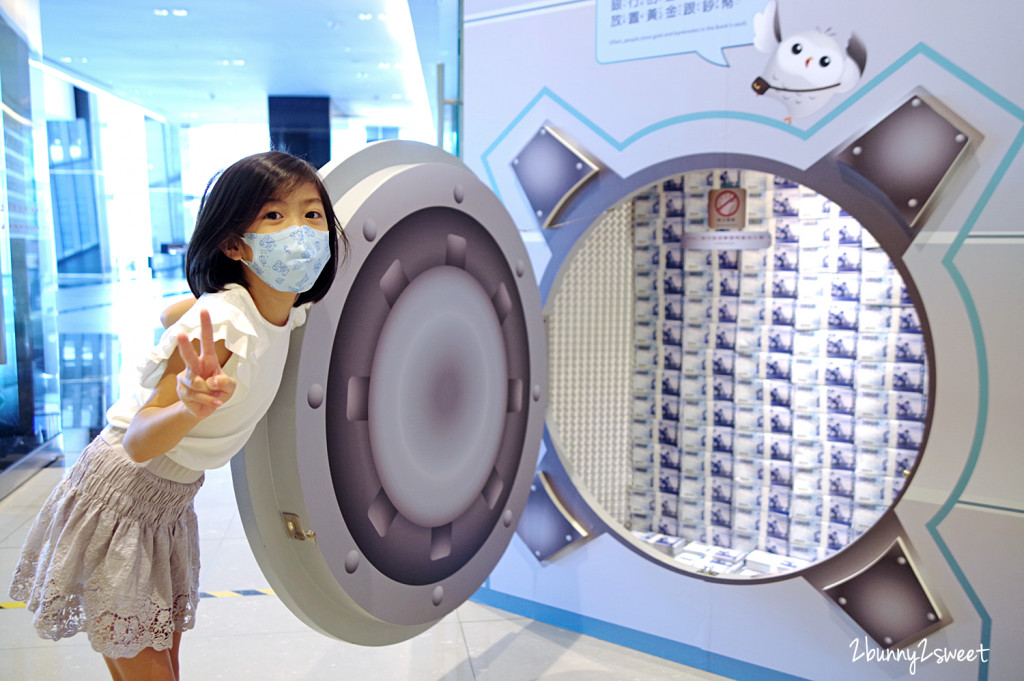 特展區就在文薈館外面,分為「過去銀行、現代銀行、未來銀行、金融動物園、新防疫生活」5個主題區。展區透過淺顯易懂的圖文說明,加上可愛的互動遊戲,讓小朋友玩中學,還可體驗收鈔票、操作數錢機等。